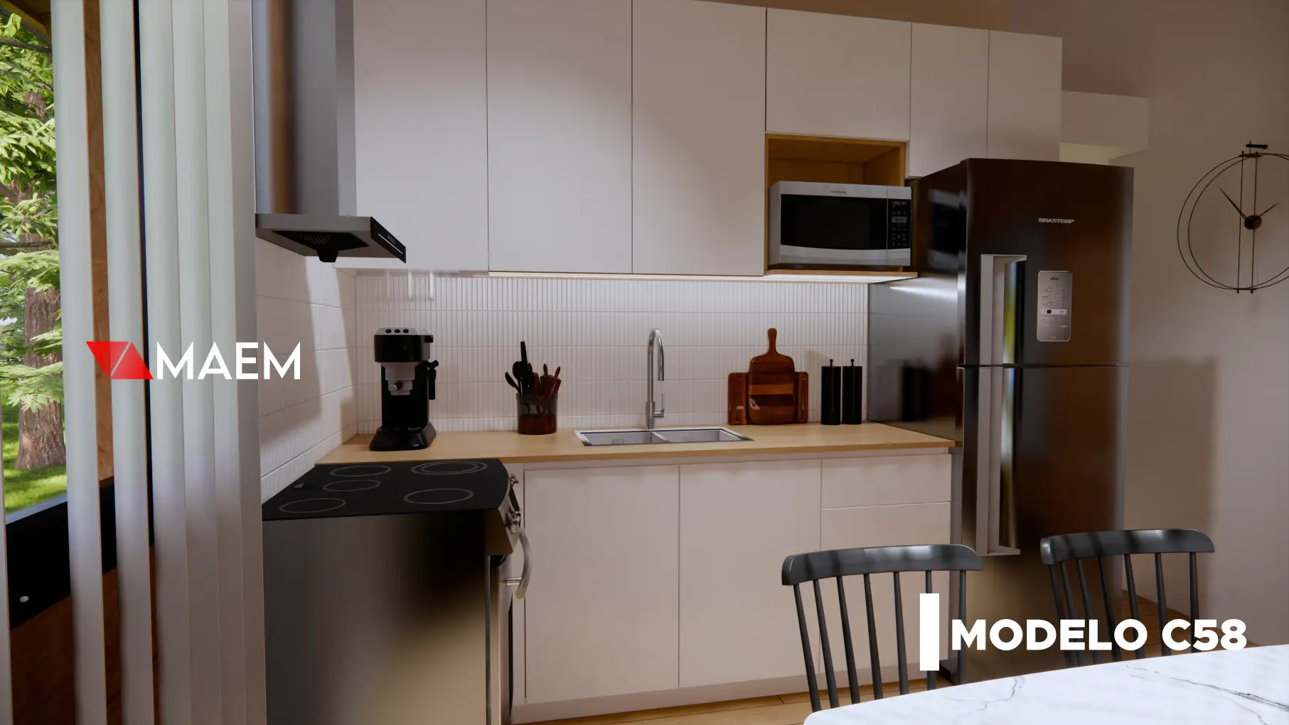 Cocina integrada al espacio social, incluyendo mesada, grifería y toda la instalación de agua con cañería de termofusión. La instalación eléctrica está incluida en toda la cabaña.